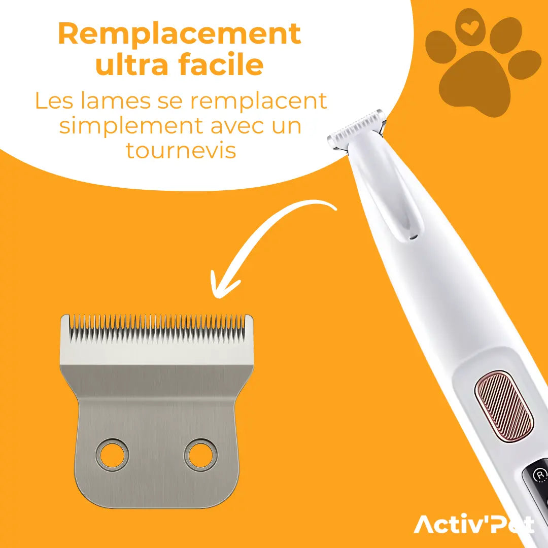 Avec une utilisation régulière, la lame de la tondeuse à pattes doit être changée régulièrement pour garantir un toilettage précis et sûr. Le remplacement est très simple : à l’aide d’un tournevis, desserez les deux vis situées en haut de la lame, retirez l’ancienne lame puis insérez la nouvelle. Revissez ensuite les vis et votre tondeuse à pattes est de nouveau prête à l’emploi.